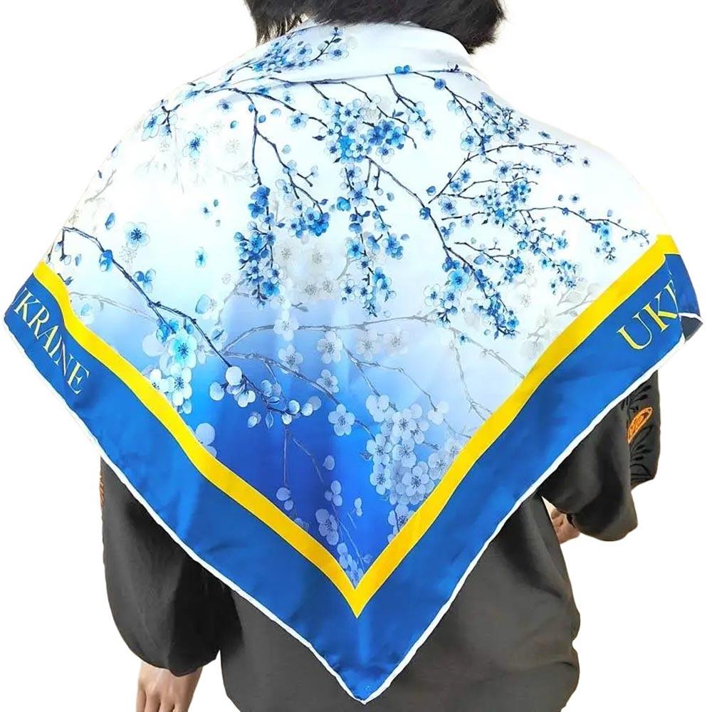 Елегантна жіноча хустка зі штучного шовку з витонченим квітковим принтом у синьо-жовтих відтінках. Розмір 90×90 см дозволяє носити її на шиї, голові, зав’язати на сумці чи використати як стильний аксесуар у зачісці. Легка, м’яка та приємна до тіла.