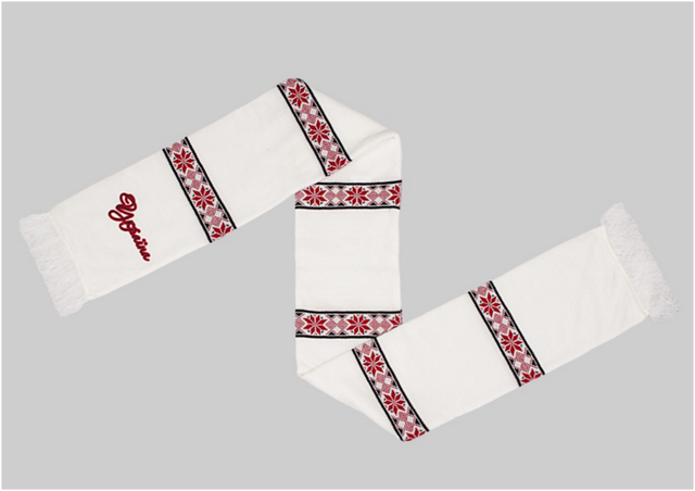 Білий шарф з вишитим написом "Україна". Розмір 140х16 см. Склад: акрил -100%
