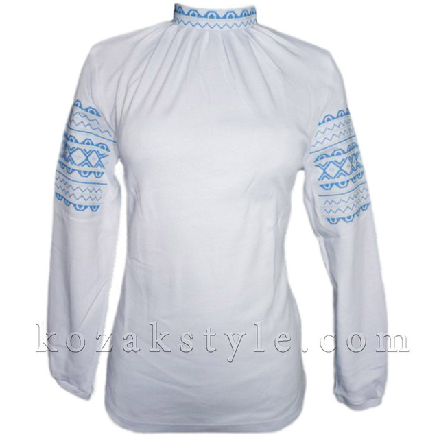 Машинна вишивка хрестиком виконана на стійці та рукавах блакитними та білими нитками.